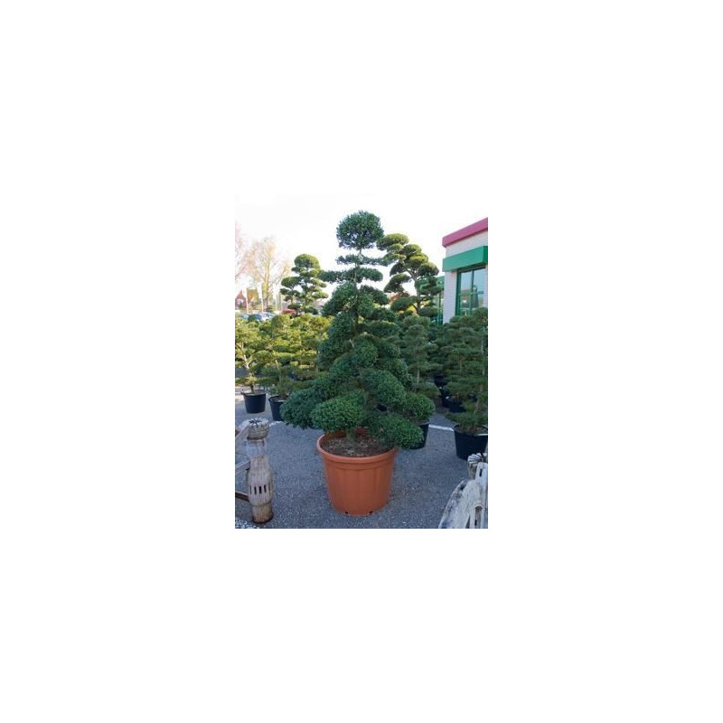 Arbuste d'ornement , formé et taillé en bonsaï , de belle taille , au feuillage persistant vert foncé et dense . Exposition à mi ombre . port érigé et très structuré . Utilisation pour plantation en isolé dans jardin japonais , en bac pour terrasse ou balcon . Hauteur 2.50 m .