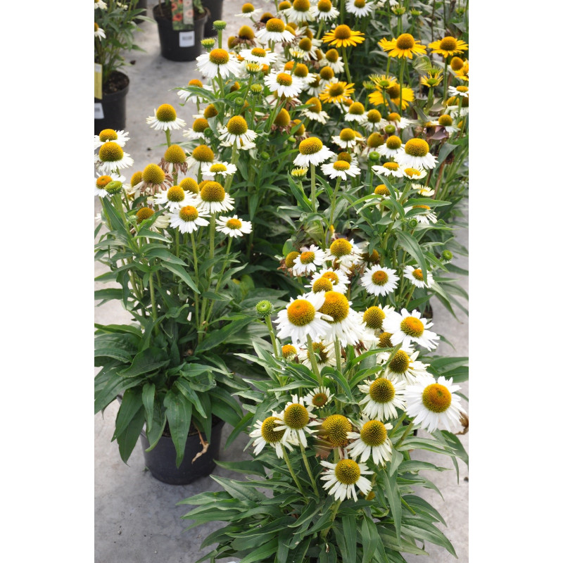 la rudbeckia blanche est une plante vivace à la belle floraison blanche en été. Feuilles caduques vertes foncées. Exposition soleil. Utilisation en massif varié.